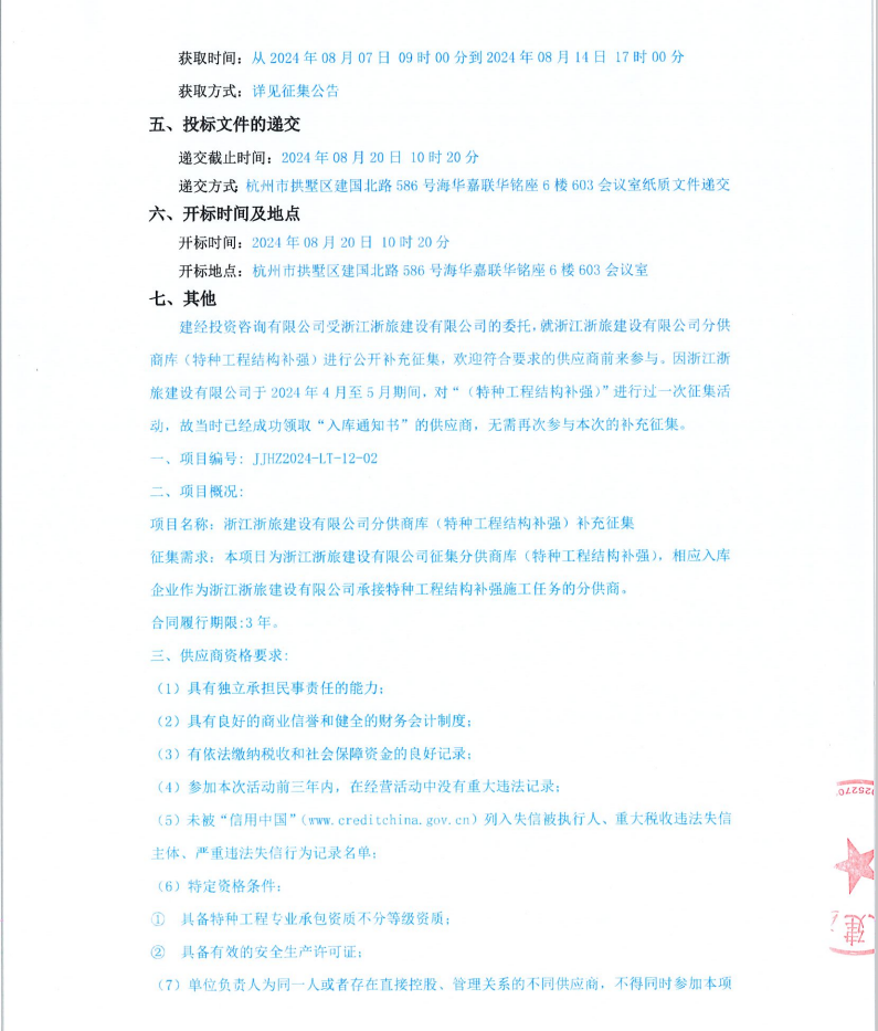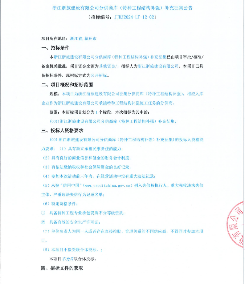 浙江浙旅建設(shè)有限公司分供商庫(特種工程結(jié)構(gòu)補強)補充征集公告
