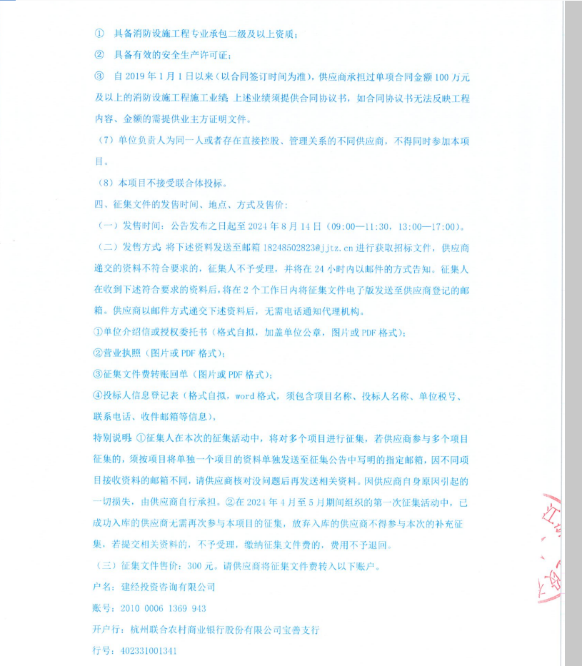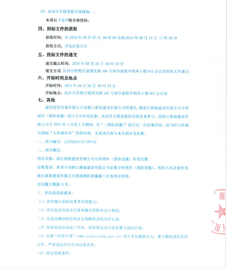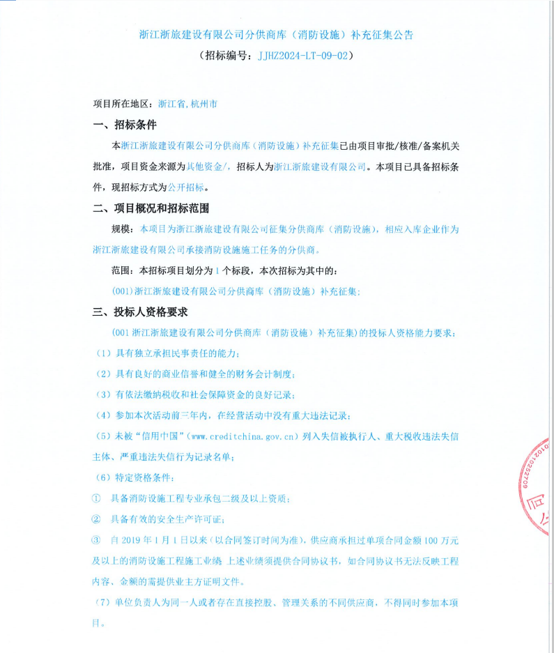 浙江浙旅建設有限公司分供商庫(消防設施)補充征集公告