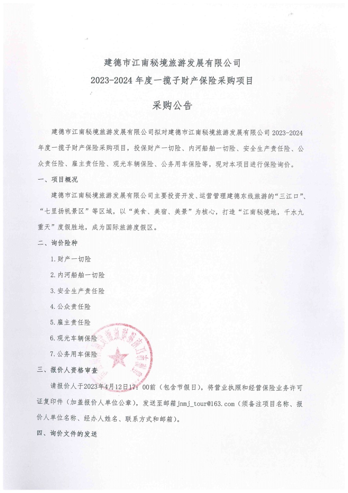 建德市江南秘境旅游發(fā)展有限公司2023-2024年度一攬子財(cái)產(chǎn)保險(xiǎn)采購(gòu)項(xiàng)目采購(gòu)公告