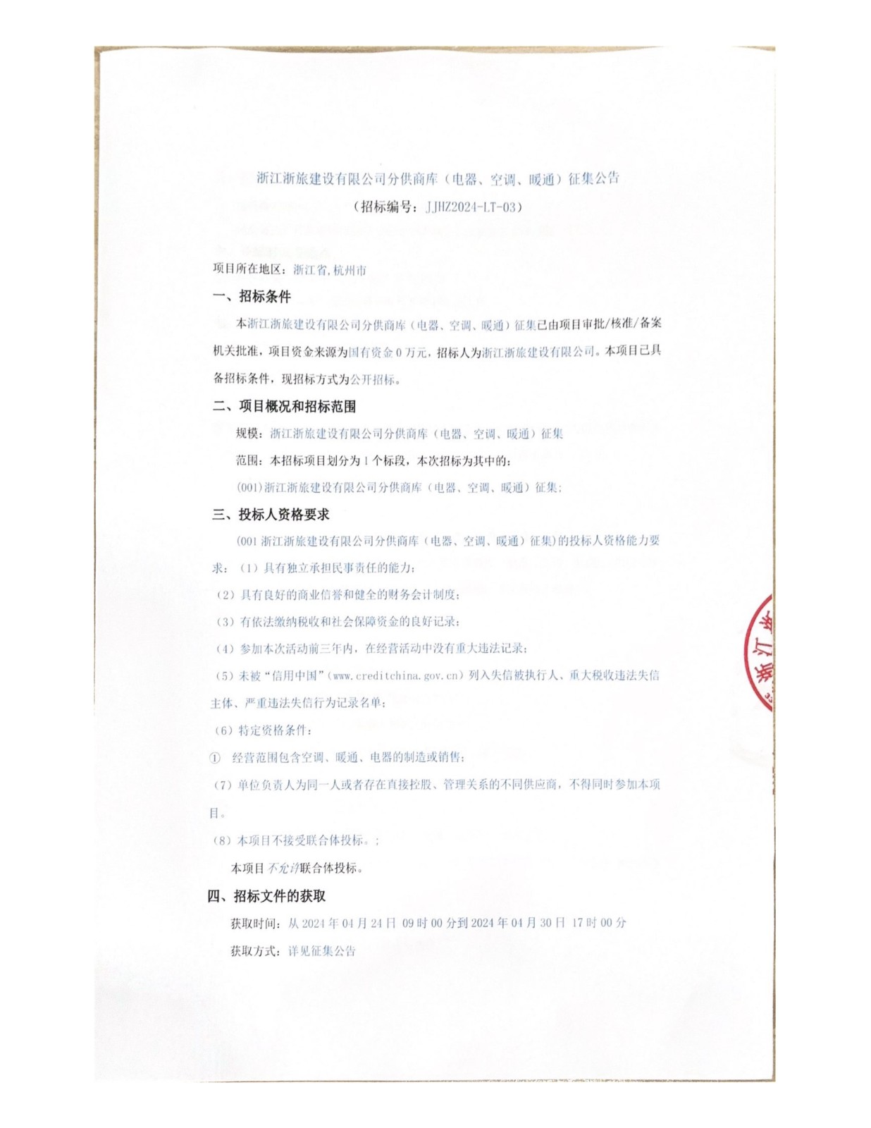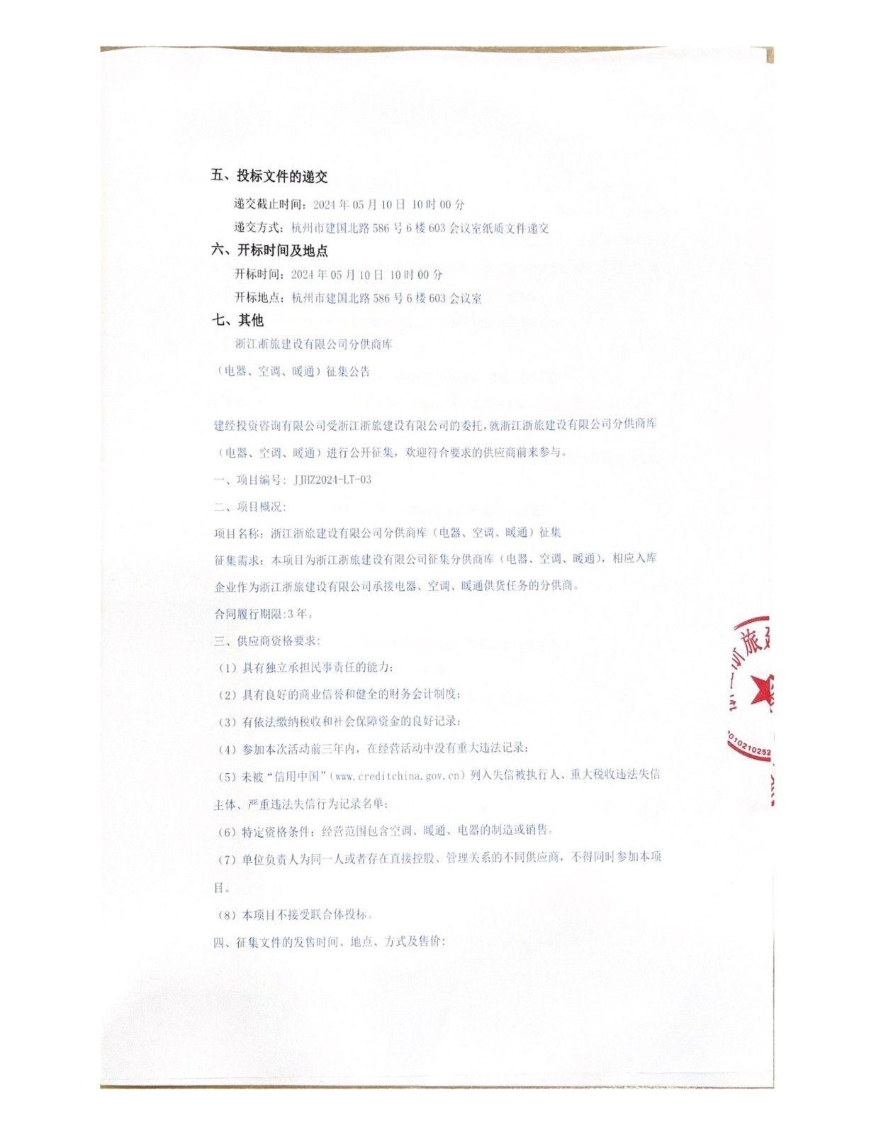 浙江浙旅建設(shè)有限公司分供商庫(kù)(電器、空調(diào)、暖通)征集公告